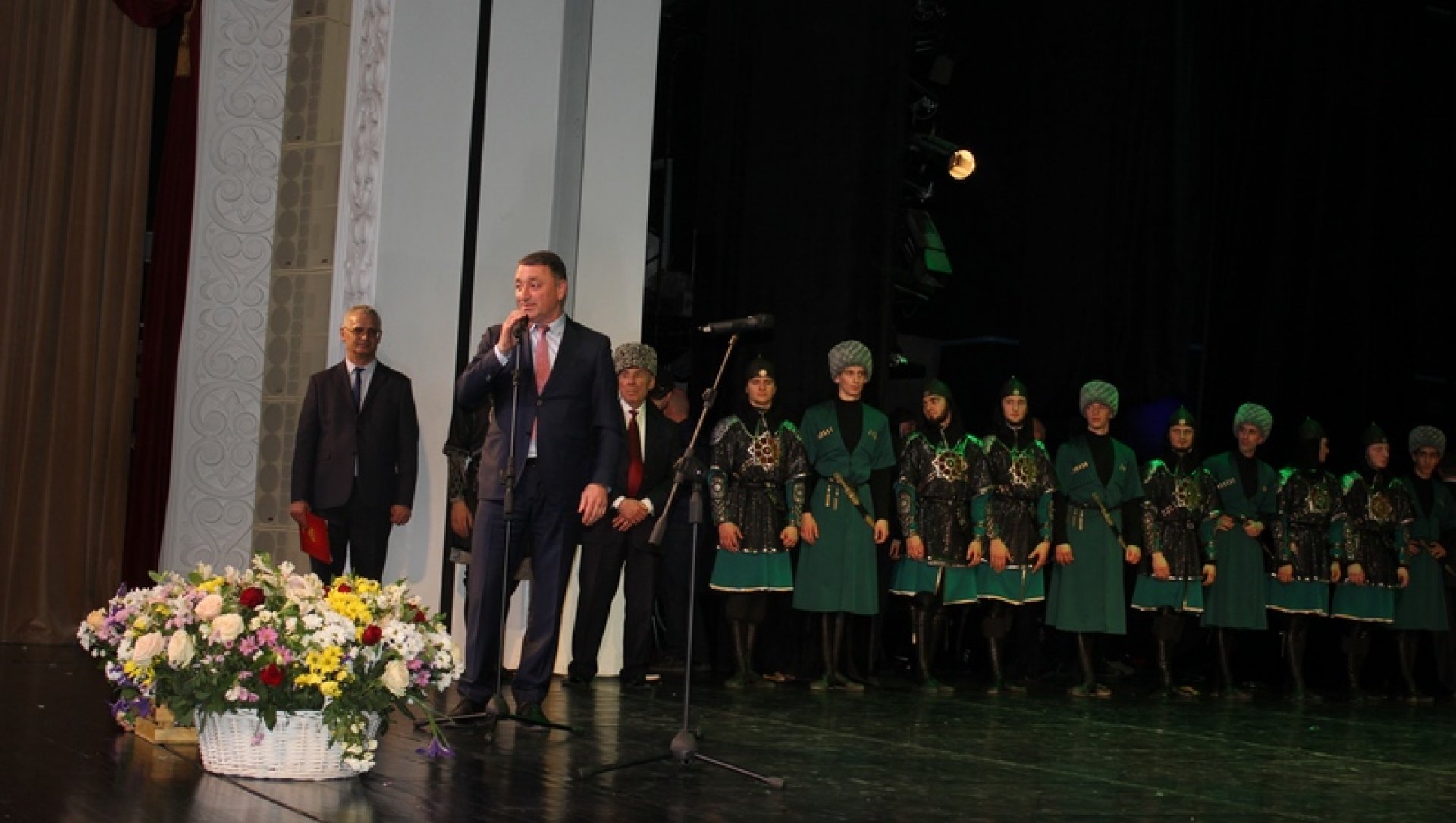 Прежде чем приступить к церемонии, Константин Джуссоев выразил слова благодарности и восхищения в адрес артистов Русского драматического театра им. Лермонтова Чечни и ансамбля «Вайнах».