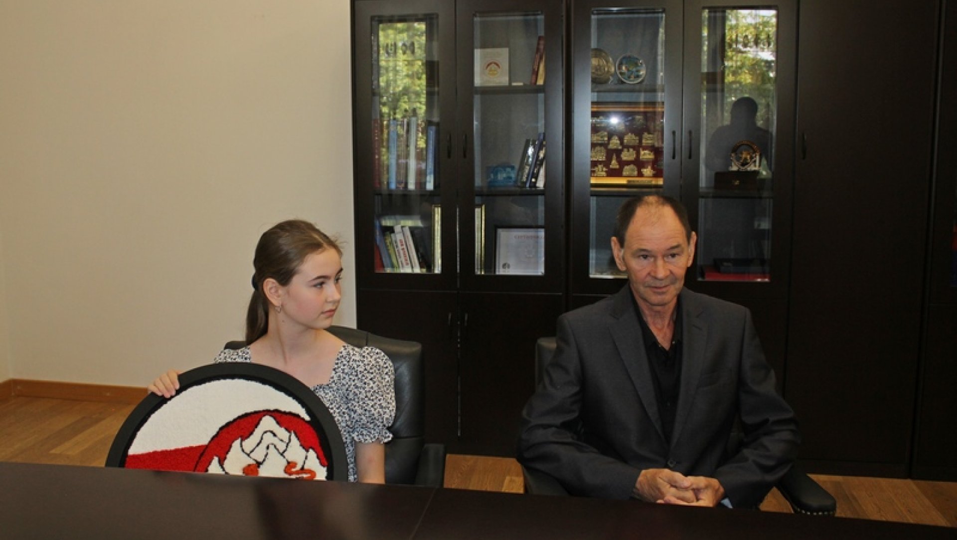 В заключительной части встречи Дарья подарила премьеру собственноручно вышитое панно с изображением герба и флага Южной Осетии, а Константин Джуссоев преподнес памятные подарки и пригласил приехать в Цхинвал снова.